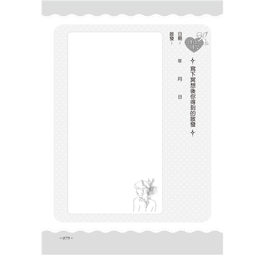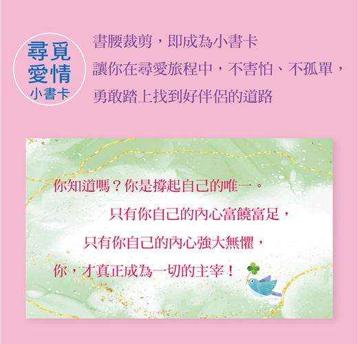 書腰再利用,裁剪下來即變成尋覓愛情小書卡。讓你在這一趟尋愛旅程之中,有一段小語陪伴著你前進,不害怕、不孤單,勇敢踏上找到好伴侶的道路!
