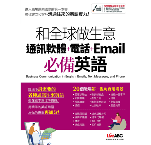 在網路發達的今日,通訊軟體、電話和email已經是企業間進行生意往來重要的溝通方式,無論是接待外國客戶、海外出差,及處理國際貿易等事宜,都需要使用到這些溝通技能,本書精選20個職場中最需要的各種商業主題,用email範例教學、實用的電話英語及通訊軟體回覆技巧來加強你的英語溝通能力。