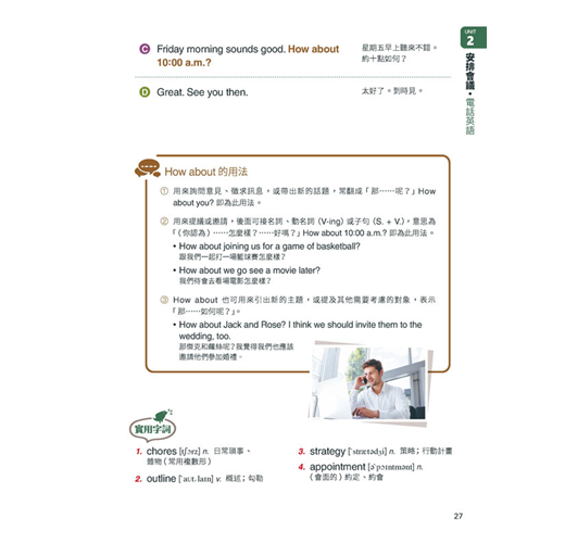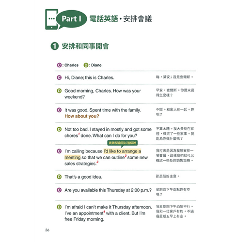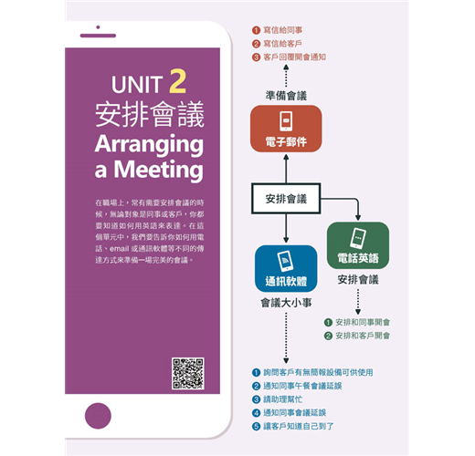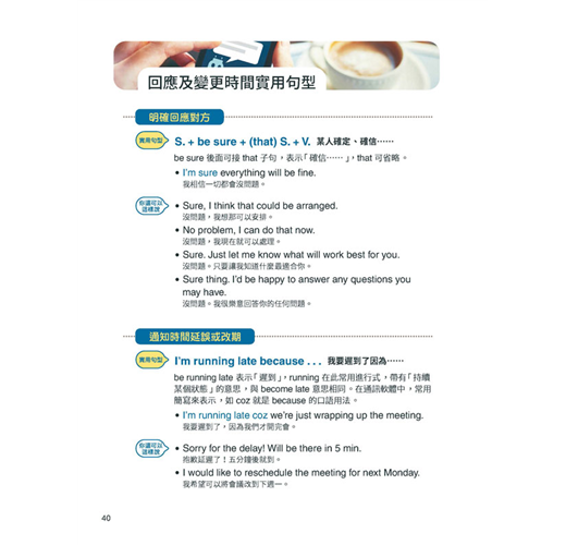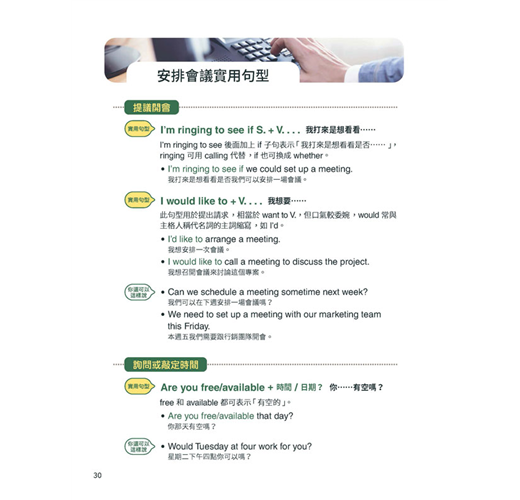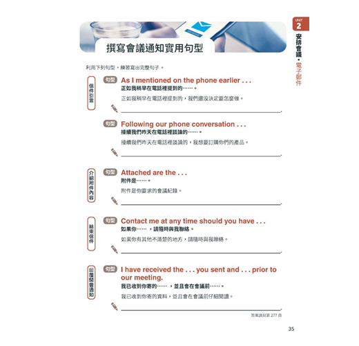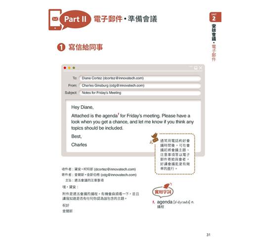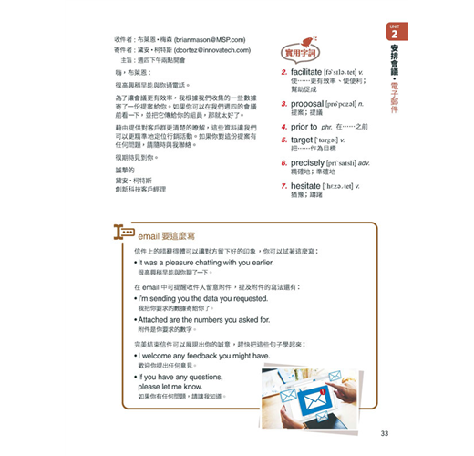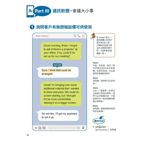首先,在「電子郵件」中,每單元會依主題提供三至五篇實用的範文,包括各種不同的情境,例如協商與議價的來回溝通、詢問商展時間及回覆確認等,以應付不同的需求。範文之後提供撰寫商業書信的實用句型,讀者可以動筆練習測試自己的寫作能力。而在「電話英語」中,我們針對電話現場的各種情況,設計最常用的應對英語,例如行業務拜訪時,打給潛在客戶或熟識客戶必須注意的態度及語氣,並補充相關的實用句讓讀者可以靈活運用在不同情境。另外,「通訊軟體」則是提供如何用最精簡的文字即時回覆訊息,例如敲定會議的時間地點、臨時請假的通知及出差時調整行程的說法等,讓你做好隨時應對的準備。