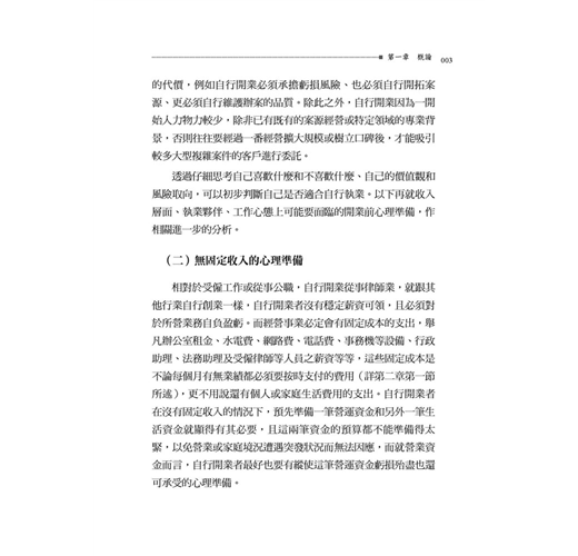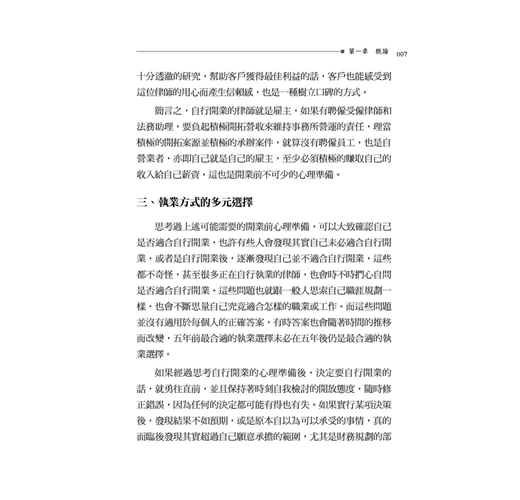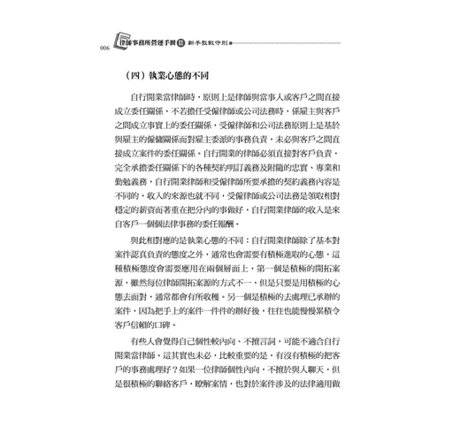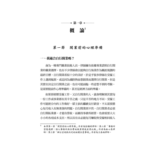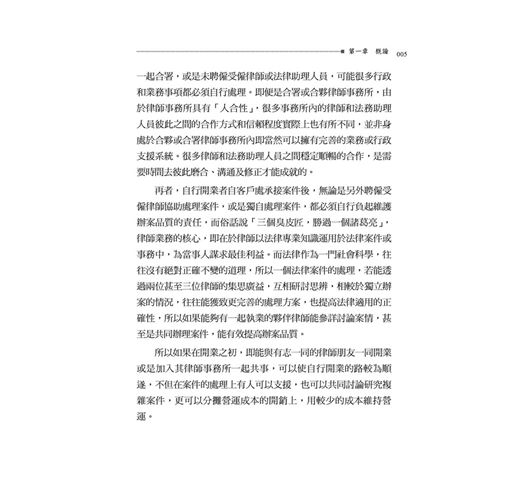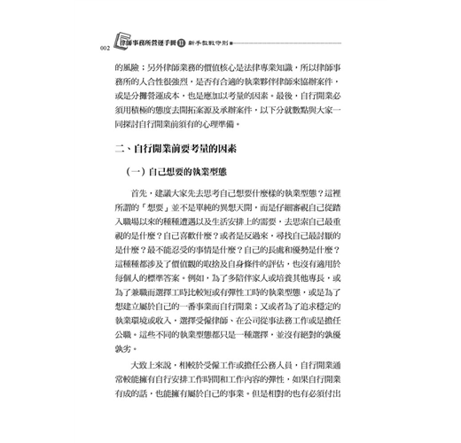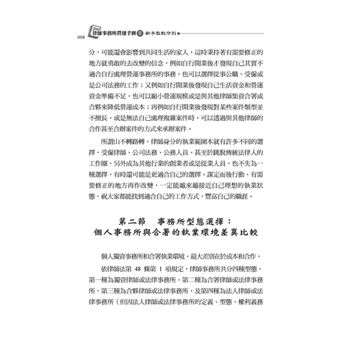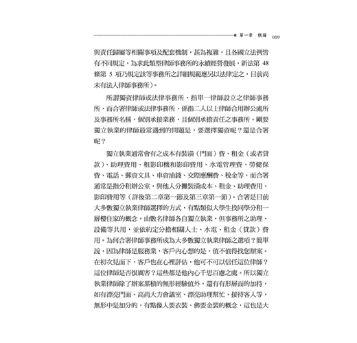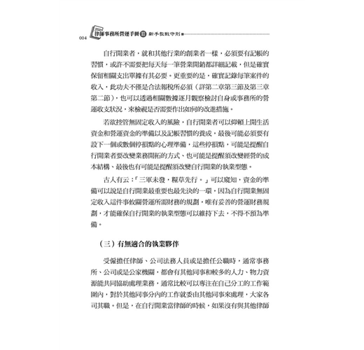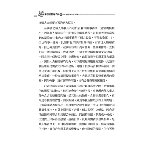 律師獨立執業之前,有許多經營及行政細節,諸如事務所經營型態、地點選擇、稅籍登記、勞健保、檔案卷宗管理等等,都必須事先考慮清楚。但不論網路上或市面上,卻幾乎沒有完整資料可供擬獨立執業或即將開設事務所的律師參考。為此,台北律師公會特邀集多名經驗豐富的律師及協助律師申報稅務的會計師共同執筆完成本書,分享一些律師事務所的設立與營運經驗,以供全國律師參考。