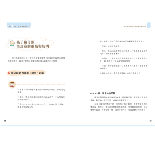 這本書匯集的文章,都是每天在牙科診間會被家長問到的問題。內容涵蓋了0~13 歲兒童,關於口腔的各種疑難雜症。這是台灣第一本由兒童牙科專科醫師撰寫的兒童口腔保健書籍,內容相當實用,誠摯推薦給大家。
