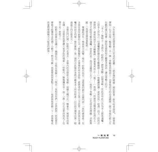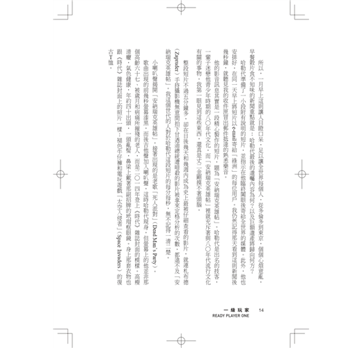在探索虛擬世界之餘也散發著一九八○年代的濃濃懷舊氛圍,就連導演約翰.休斯最死忠的粉絲也能被取悅……窩心但自貶的主角韋德所屬的宇宙怪異地融合了真實的過去和虛擬的當下,他是不可思議卻令人喜愛的完美主角!──《出版人週刊》