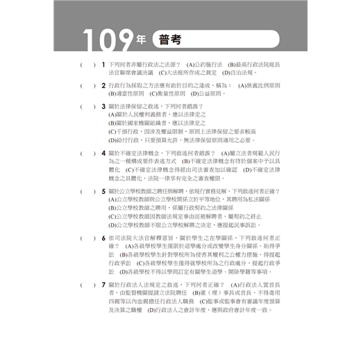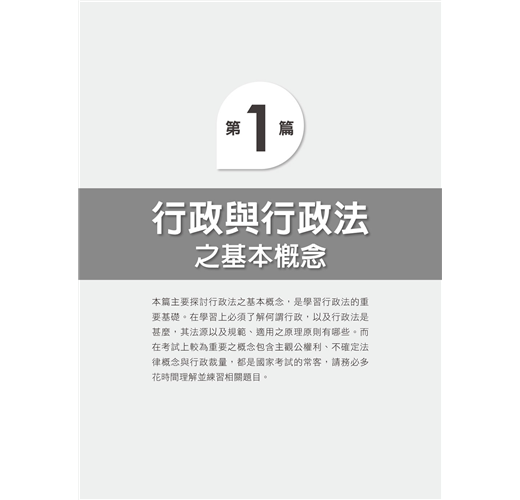由於「行政法」本身並非一部成文法典,舉凡被劃定為公法範疇之法規,幾乎得作為行政法之法源,包含適用於各個行政法領域之一般行政法,例如行政程序法、組織法、公務員法、爭訟法等,以及適用於個別領域中的特別行政法,例如警察法、財稅法、環境法等。光是要從前面所說內容找出重點,就已經令人頭疼不已。因此,本書的編寫就是要帶你找出最上位之基本觀念,並轉換為常識,這樣就算考題在多變,你也不需要害怕!