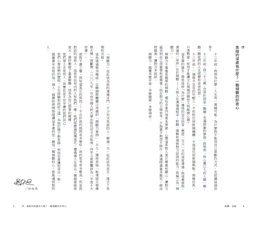 這本書的誕生,就是這些「為什麼」獲得的空谷回音。歷經一次又一次的深度溝通,我逐漸發現,溝通的「祕訣」在於傾聽——人與人在溝通過程中,聆聽、理解和領悟對方話語的能力,我稱之為「傾聽力」。