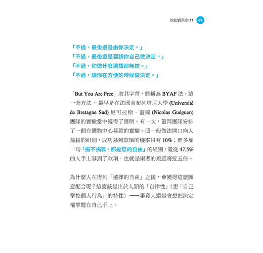 諾貝爾經濟學獎得主、行為經濟學家理查.塞勒(Richard Thaler)提出「推力」(nudge)概念,英國政府加以運用,只在催繳稅款通知上多寫這一行字:「大多數的英國國民都有納稅」,讓尚未繳納的人覺得「我也得趕快繳稅才行」,結果補繳率上升三成!