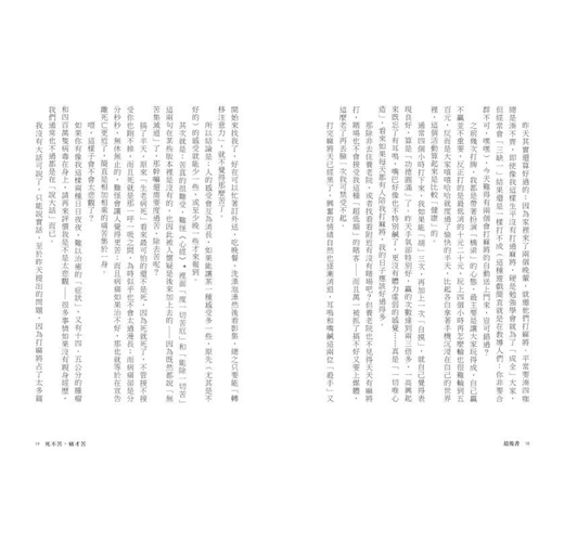 我很喜歡這些日記(倒不是我愛窺探他人隱私),從日常瑣事著眼,旁及人生哲學、自然科學等思維,讀來很有感觸。如首篇日記提到,作家深受耳鳴之苦,但醫生表示,已過治療期,勸慰病人只能與之「好好相處」。乍聽無奈,但其實人生何嘗不是如此?家庭、職場、生活總有不如意處,而這些無法輕易改變之處,與其哀怨度日,何不換個想法與之共處?第二天的日記作家更進一步談到與苦痛共處的方式:「人的感受會互為消長,能讓某一種感受多一些,原先(尤其是不好的)的感受就能少一些,或至少晚一些才來報到。」日常的苦痛不會驟然消失,但透過注意力的轉移,或許能減少不愉快的感受,也會讓我們生活好過一些。