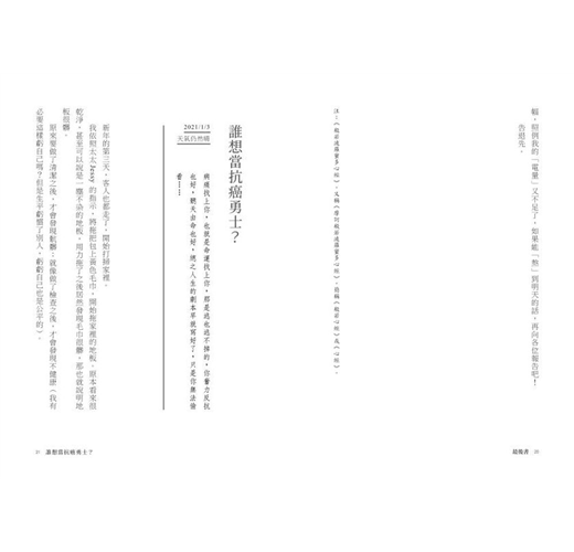 很多事在發生後已成既定事實,它不會因為我們的慌張失措或懊悔不已而改變,就像苦苓大哥身上的腫瘤與病毒,也不會因為我的擔心焦慮而消失無蹤。況且當事人勢必經歷我們難以想像的內心煎熬,各種可能的解方肯定也諮詢嘗試過。分開後,我陸續收到其他篇日記,每看完日記便有些感想,寫下讀後感回信。只是當時,我並不曉得這些回覆對他的意義,直到我看了這本書的後記。