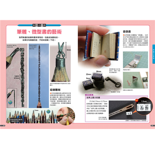 本書共分成四個部分:「玩1mm的遊戲吧!」「來體會1mm吧!」「放大1mm」、「微米、奈米的世界」。每個類別皆以跨頁全彩的方式呈現,每一個跨頁都對應一主題。全書共有33個主題,每個主題都可以獨立分開閱讀,讀者可以選擇自己所需要的內容。