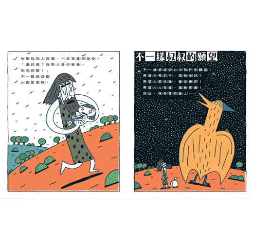 不一樣叔叔做的正是這些事情,勇敢追逐夢想、堅持到底、關心他人、知足的生活著。這些大家都明白的道理,卻因同行夥伴不多,外在顧忌過分干擾而放棄,然而當群體都不再追逐夢想、毫無耐力、冷漠、貪婪……會是什麼模樣呢?不再是讓人安心自由的世界了吧!這時我們就不得不問:既然我們都是獨特的個體,我們之間也會是不一樣的。不一樣,很奇怪;只是,又為何一定要「合乎常態」呢?