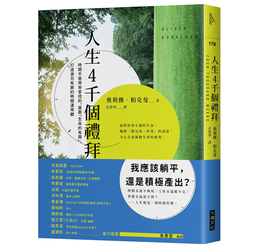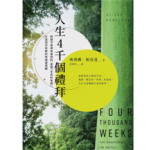 人人都知道時間不夠用。我們成天忙著應付愈來愈長的待辦事項清單,清理塞爆的收件匣,努力平衡工作與生活,還得隨時隨地對抗分心;一大堆的建議都教我們如何更有生產力、更有效率,要我們化身為「生活駭客」,善用一天之中的每一分、每一秒。然而,這樣的技巧通常只會火上添油。我們愈來愈焦慮,一直想要加快速度,但人生中最有意義的部分,永遠位於地平線之外。然而,我們很少把每天疲於應付時間不夠用,與最重要的時間管理問題想在一起:如何好好運用我們在世上的四千個禮拜。