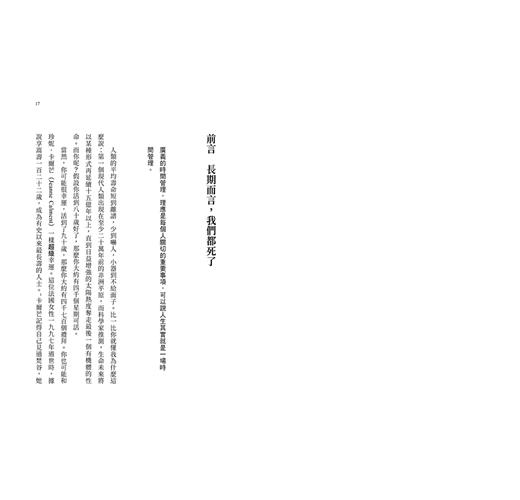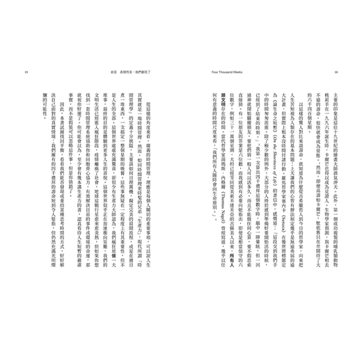 現代人被要求和機器一樣穩定不懈,不斷追求效率與產能,很多時候到了走火入魔的地步。許多時間管理課程,教我們怎麼用各種新奇小技巧來擠出更多餘裕,但是,如本書作者所說,「最終的時間管理是人類有限的生命」,當我們從這個制高點看,會發現許多汲汲營營變得無謂且單薄。作者從各方學科旁徵博引,改變我們對「時間」的認知,找到自己努力的意義。