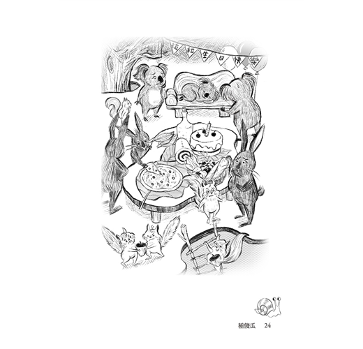 閱讀的過程中,各個的動物角色形象便已像動畫般在我的腦海中浮現,他們的喜怒哀樂甚至細微的表情、情緒,都想趕緊記錄下來,哪怕一個閃神,憤怒的浣熊爸爸或得意洋洋的灰驢大叔便稍縱即逝!畫著畫著,總覺得自己像是導遊一樣,畫筆是我高舉的旗幟,帶著讀者跟著動物家族們,一起在森林之中遊歷樹屋的派對、瞧瞧山羊博士的實驗室一隅、目擊灰驢大叔家的「血汗工廠」、瞥一眼浣熊家的「玩具間」……,期待讀者們在享受文字的過程中,彷彿也跟著可愛動物們玩了一回!