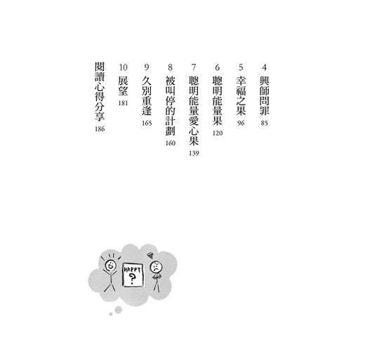 本書劇情除了有趣之外,還有許多值得細細咀嚼之處,同時也拋出了人生大哉問。所謂「幸福」是什麼?又該如何去定義?若跳脫抽象,它會長成什麼樣子呢?答案肯定也會隨著不同的年紀有所變化,就跟不同年紀對「活著的意義是什麼」答案一定也不一樣。對我而言,幸福即是此刻;對妳/你而言呢?