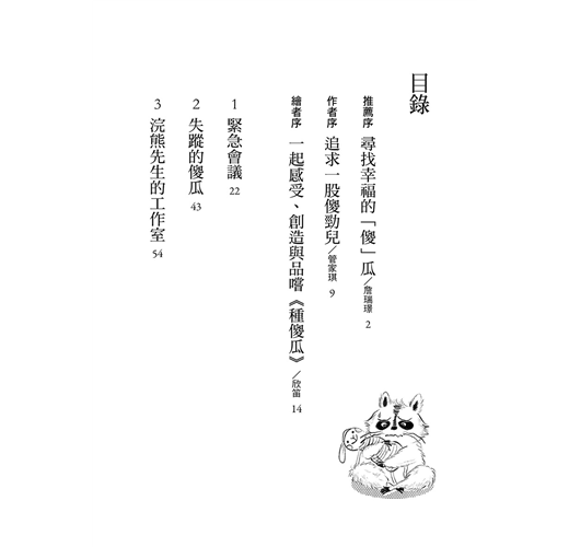 西瓜、東瓜、南瓜、黃瓜、苦瓜、香瓜、絲瓜、哈密瓜……世上各式各樣的瓜那麼多,浣熊先生種的「傻瓜」是什麼樣子?吃起來的滋味如何?最重要的是,這到底是一種什麼樣的瓜?吃了之後會怎麼樣?會讓人突然莫名其妙做很多傻事嗎?還是……