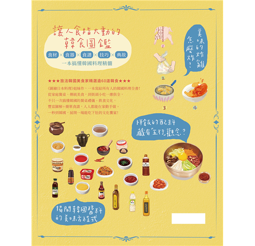 本書內容涵蓋食材、食譜、手法、技巧、餐桌禮儀、歷史典故⋯⋯一切有關韓國飲食的文化、典故和大大小小知識都在書中,如果你對韓國飲食有興趣,這本書有一切關於韓食文化的解答!