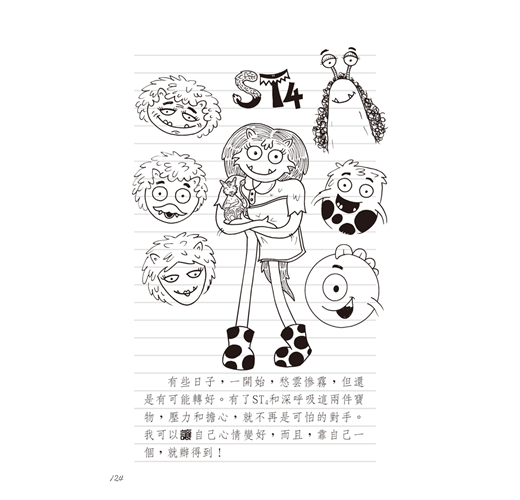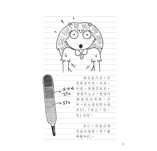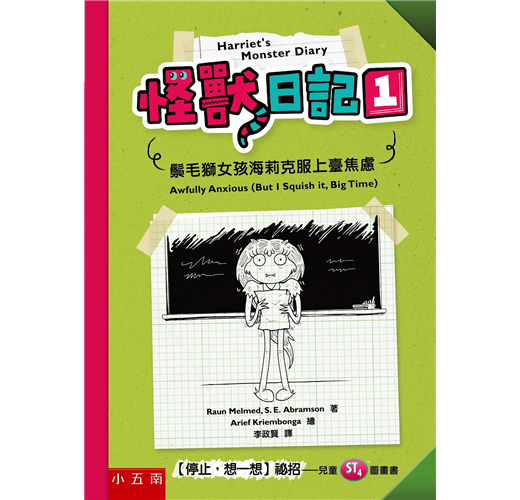 海莉的怪獸日記,風趣的情節和插圖,運用梅爾梅德醫學博士發明的「ST4(停止,想一想)祕招」和「怪獸四色壓力計」,陪伴孩子學會監控自己的感覺,以及面對壓力的應對策略。在鬃毛獅阿嬤,還有怪獸好朋友小馬、丁丁的支持、幫助之下,海莉學會深呼吸靜心正念,DIY製作「怪獸四色壓力計」和ST4徽章貼紙,終於克服上臺焦慮,勇敢面對困難!