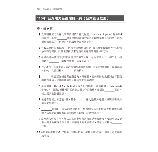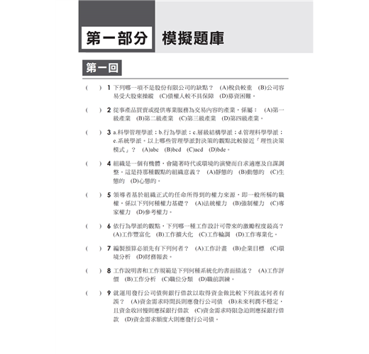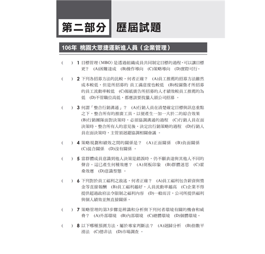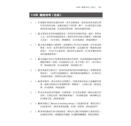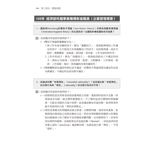 針對模擬題作正確完整之解析,可直接了解並熟記企管相關理論,不需要再翻閱其他書本。尤其可作為考前衝刺,獲取高分的利器。