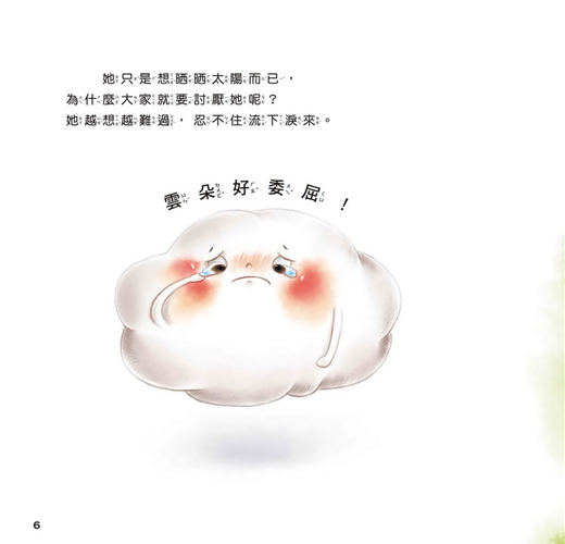 幼兒成長過程中必經的8道心靈困境課題:生氣、害怕、貪心、說謊、害羞、嫉妒、自卑、委屈請您一起陪伴孩子提前練習天空的雲朵只是想舒服的晒晒太陽,但卻引來人們埋怨的聲音,為什麼呢?面對莫名的敵意,委屈的雲朵,哭了……當雲朵停止哭泣後,雲朵聽見了不一樣的聲音。原來她滴滴答答的眼淚雨,有好多人是感謝的。