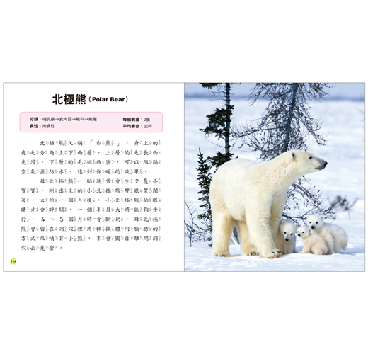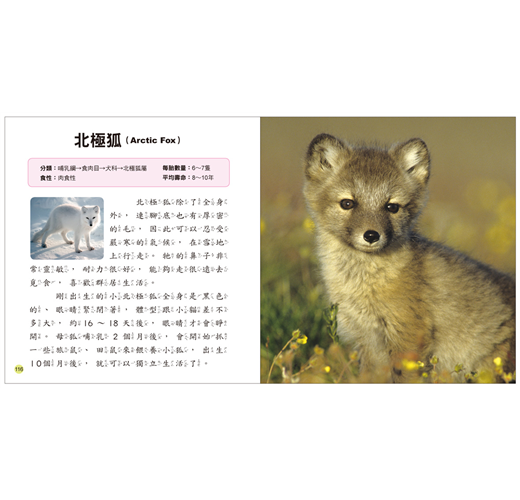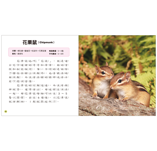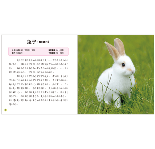 4. 每一種動物寶寶均標示生物學上的分類、食性、每胎數量、平均壽命等基本資料,除了強化認知,也方便查閱,可以讓孩子快速建立基本概念。