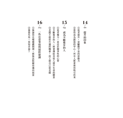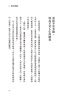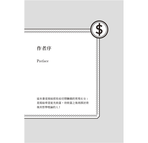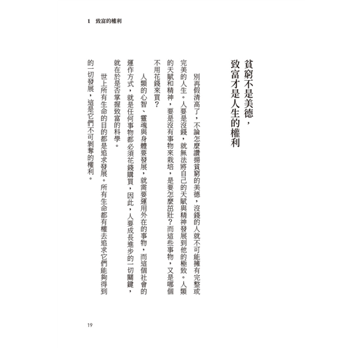 在這本書中,我不跟你講什麼人生大道理。我不會說「人要知足常樂」之類的陳腔濫調。如果有辦法得到更多,到底有誰會甘願屈就於眼下呢?大自然的一切,就是生命在追求發展並臻於完美。所以,每個人都應該擁有能夠幫助他的人生得到權力、優雅、美好和豐盛事物的一切事物。「知足常樂」這種陳腔濫調,實在害人不淺!