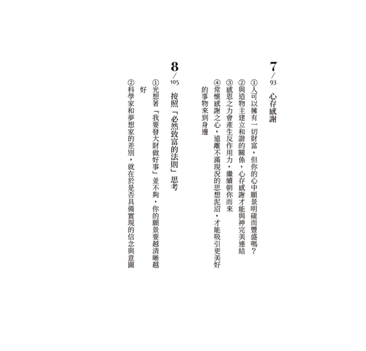 人可以擁有一切財富,但你的心中願景明確而豐盛嗎?/與造物主建立和諧的關係,心存感謝才能與神完美連結/感恩之力會產生反作用力,繼續朝你而來/常懷感謝之心,遠離不滿現況的思想泥沼,才能吸引更美好的事物來到身邊