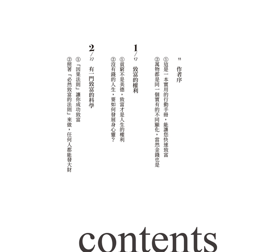 透過了解這些致富之人的背景,我們發現他們各方面都很平凡,與常人無異,沒有比其他人更優越的天賦或能力。顯然,他們會致富,並非因為自己的天賦或能力過人,而是他們剛好都按照一個「必然致富的法則」做事。