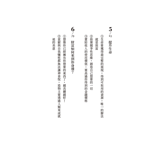 ▍世上沒有貧窮,只有富裕/不用再鑽研讀其他理論了,這本書就有最簡單、直接的致富法則/將思想與行動互相連結,啟動所有創造力為你工作