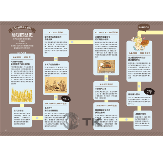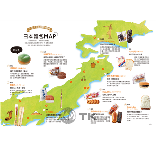 《世界麵包百科圖鑑》一書中,日本人用鉅細彌遺的研究精神,把世界各國最具代表性的麵包羅列呈現,將每款麵包的原文名字、主要原料、製作方法、食用方式,甚至文化背景,用簡單扼要的敘述介紹給讀者:長棍、貝果、瑪芬、司康、咕咕洛夫、潘娜朵妮、布里歐,愛吃麵包的人對這幾款應該不陌生,不過它們的用料、烘焙過程和身家背景,也許大家尚不清楚;至於伊朗的巴巴里麵包(barbari)、土耳其的芝麻香料餐包(Ekmek)、荷蘭的虎皮麵包(Tijgerbrood)、芬蘭的船型餡餅(Karjalan Piirakka),光聽名字就讓人著迷,就算還沒緣吃到,讀著異國麵包的文化故事,仿佛四海神遊,繞了世界一圈。