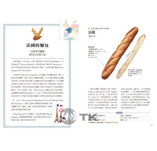 這本『世界麵包百科圖鑑』,以歐洲、亞洲、北美南美、非洲中東,等地理位置區分,再細分為各個國家,共收錄123種最常見受歡迎的麵包。每種都詳細地記錄不同店家的製作材料與內容、特色,外觀與剖面照,將比例層次與組織結構紀錄成完整的圖文。還有日本13家頂級吐司&日常吐司的完整紀錄分析;中東、伊朗吃什麼樣的麵包?衣索匹亞又是以什麼麵包為主食?