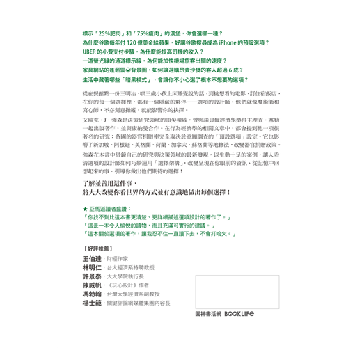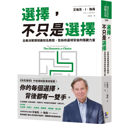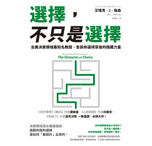 強森在本書中借鏡自己的研究與決策領域的最新發現,以生動十足的案例,讓人看清選項的設計師如何巧妙運用「選擇架構」,改變呈現在你眼前的資訊、從記憶中回想起來的事,引導你做出他們期待的選擇!