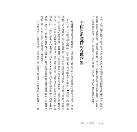 2. 本書提出選項設計的相關研究和案例,大多非常生活化,比如從冰淇淋口味的排列順序、瘦肉與肥肉的標籤說明、Uber計程車小費比例設定等,讓人更容易察覺到在日常生活中有哪些選擇架構的設計影響我們的決定。