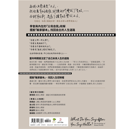 溝通分析、腳本分析心理學大師艾瑞克‧伯恩帶領我們看見自己的人生腳本──看見父母養育的影響、看見歷代親屬的腳本關聯、看見內心深處不斷誘惑我們做出錯誤決定的聲音……唯有學會與「父母自我」和解,才能跳脫「悲劇性」的人生結局。
