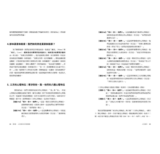 悲劇性的人生通常有著「壞」的心理地位,不論是:「我好-你不好」、「我不好-你好」、或是「我不好-你也不好」。這些心理地位影響著我們如何面對這個世界──憂鬱、不滿、傲慢、奴性、憤世嫉俗……讓我們感到痛苦與怨恨。找回「我好,你也好」的健康心理地位,跳脫「人生腳本」與「心理遊戲」的控制。