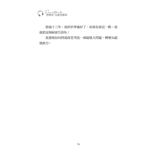 《紐約時報》暢銷書作家喬恩.阿考夫,在本書中提供了一個行之有效的計畫,幫助你從過度思考這個超級問題變成超強助力;讓你運用改變「想太多」的驚人力量,創建出一套專屬你的希望、夢想、目標,和人生各層面的最佳配樂清單。
