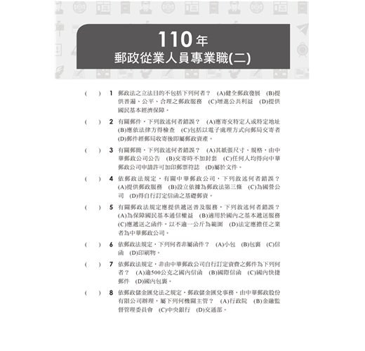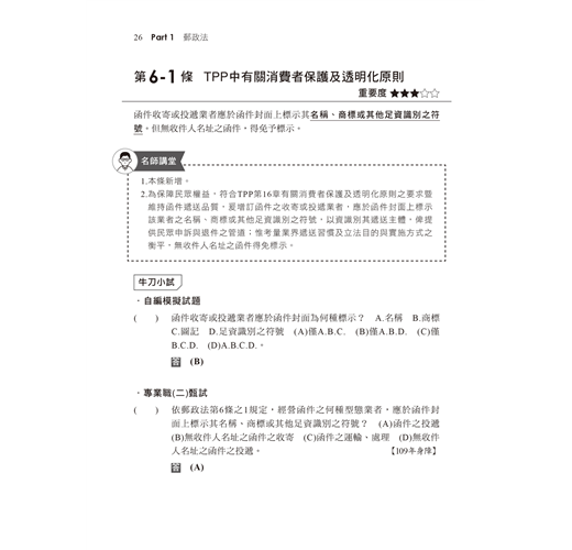 驗亦豐富的高階主管所親自編撰,其對命題委員的思路、習性、業務熟稔度及其可能的試題佈局可說瞭若指掌,因此能掌握命題的範疇,以及每個法條所可能出現的關鍵字句(Key Words)所在,因此本書的編寫能夠為考生有條理的解析各個常考的郵政法條重點。