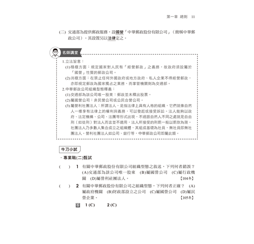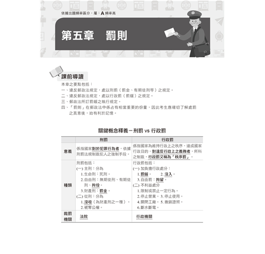 法規完整收錄,並且逐條附有條文解析,不用再另行準備一份條文比對書本內容。再者,為免誤導考生,將本書中所有的課文內容及各種考試歷屆試題,都以最新(已經修正的條文及概念)的規定及概念加以更新。例「中華(台灣)郵政公司」一律修改為「中華郵政公司」;「行政院金融監督管理委員會」一律修改為「金融監督管理委員會」等。此外,作者就郵政法規若干條文中的「立法精神、立法旨意或關鍵概念」,考生較易混淆或不明瞭之處,在全書相關地方以「名師講堂」、「概念探索」、「概念補給站」或「表列整理」