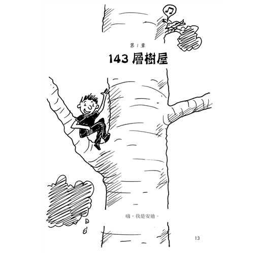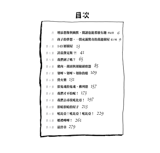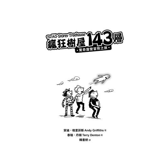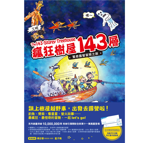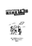 歡迎來到瘋狂樹屋143層,這裡有:萬能文字機(沒有它不知道的字!)、可以拆掉房子的拆房鐵球、抱怨室、陰森森的墓園(這裡永遠是半夜,大白天也一樣)、善良稻草人看守的太妃糖蘋果園、可以度過愉快輕鬆假期的露營地,還有住著噴火龍的又深又陰暗的洞穴。還在等什麼?快上來吧!