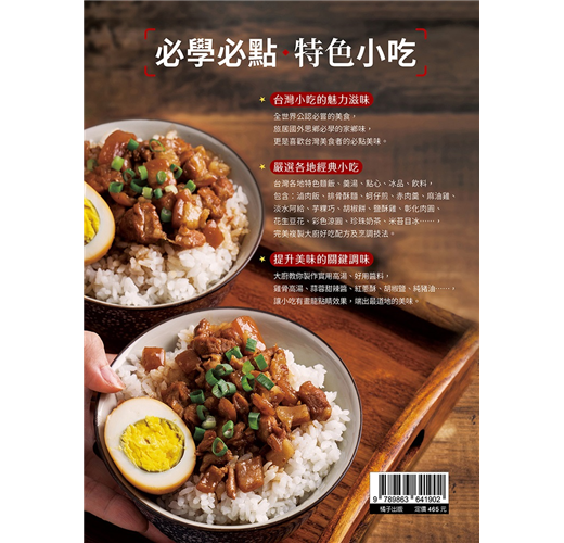 全世界公認必吃的美食,旅居國外思鄉必學的家鄉味,更是喜歡台灣美食者的必點美味。嚴選台灣各地經典麵飯、羹湯、點心、冰品、飲料,包含:滷肉飯、排骨酥麵、蚵仔煎、赤肉羹、麻油雞、淡水阿給、芋粿巧、胡椒餅、鹽酥雞、彰化肉圓、花生豆花、彩色涼圓、珍珠奶茶、米苔目冰⋯⋯,完美複製大廚好吃配方及烹調技法。