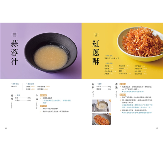 教你自製天然高湯、各種醬料、紅蔥酥、蒜頭酥等,並提供完成的重量、保存方式和適合的小吃頁碼索引。