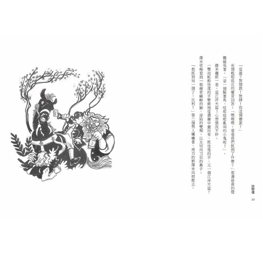 有個粗啞低沉的聲音回答:「嘿嘿嘿,看看我們抓到了什麼?」那盞昏黃的燈籠搖曳著,「是一個騎著馬、哇啦哇啦亂叫的小鬼呢!」