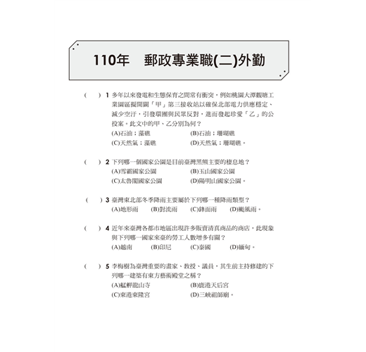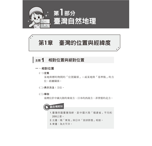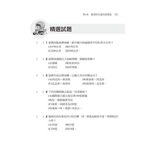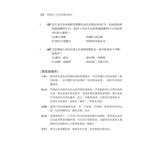具有豐富圖表解說說,幫助讀者加深記憶,建立完整知識。各章精編【精選題庫】,可供各位演練,試題來源網羅各類台灣自然地理及人文地理考題,每一題均有詳細解析,使您可節省相當多的時間蒐集試題及尋找答案,直搗命題核心。