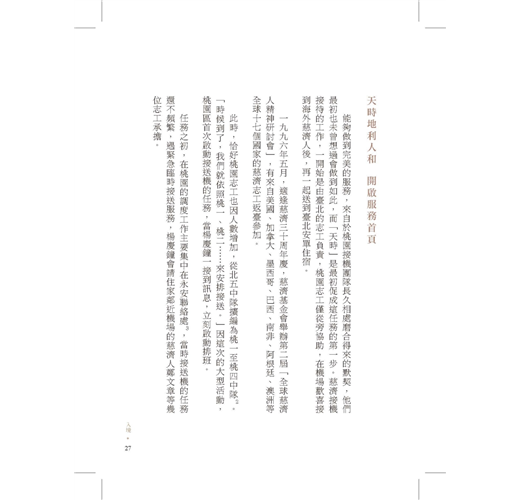 慈濟人的歷史、慈濟人的故事,就是菩薩道最好的見證。所以,我很重視歷史。所到之處,我都在催促每個人要整理出歷史——空間、時間、人與人之間,這三項都要完備。