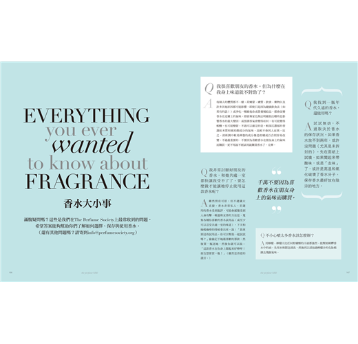 「一直以來我都把香水視為身上最重要的『隱形裝扮』,若是只重視視覺上的搭配,卻少了嗅覺的魅力,就稱不上就不完美了!這本書可以說是跟我一樣的香水狂會想要收藏的秘笈,更是一本適合入門者的香水知識庫。除了有專業的香水知識,更蒐羅各品牌香水評析,還有實用的香水使用Tips!不論是對香水一無所知或是已經有使用香水習慣的女孩,都能從這本書中更深刻了解迷人香氣背後的更多故事!」