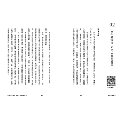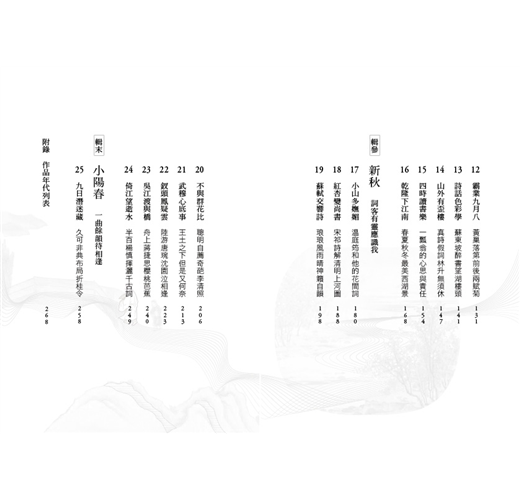 以身歷其境的自如,遍訪過往文人的詩心。一首好詩,辭句長短、句中字數、押韻與否都在其次,重點是如何拿捏日常,將生活細瑣轉換成讓人動容的篇章。一詩一詞交相輝映,當可列為文學美談一樁。