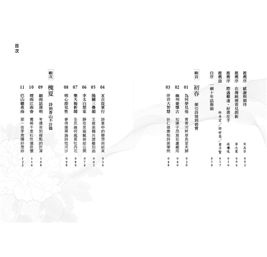感謝漢光教育基金會董事長宋具芳女士,沒有她賡續文化火種的初衷,不會有我鑽研提筆古典詩詞新詮的願力。萬分感激陽明交大林奇宏校長、廣達集團梁次震副董事長所給予的鼓勵加持。感恩和碩集團童子賢董事長與華碩集團徐世昌副董事長,在忙得不可開交的時刻仍親筆為文推薦。銘謝知我一路走來的同窗好友溫瓌逸老師,能把序文寫得如盧藏用為陳子昂寫小傳般如數家珍。謝謝設計名家王翔先生出手封面救援,讓書本在古樸裡顯出光彩,還有書法藝術家洪禎蔚女士發揮學者精神為輯名費心選圖。最後由衷敬謝始終作為第一位讀者,不斷指點我文章用字除錯的編輯達人杜晴惠女士。