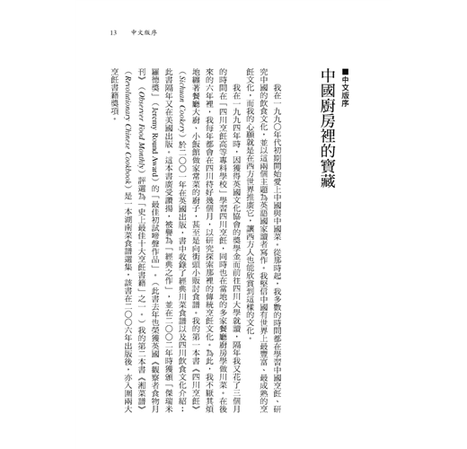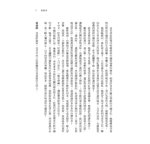 扶霞融合外來的客觀視角與長年生活於中國的本土眼光,對川湘菜系做有趣的第一手報導,且不乏對當今充斥各地的一些惡質飲食習性進行針砭批判,想必會引起中文世界讀者的讚賞與共鳴。──莊祖宜(飲食作家)