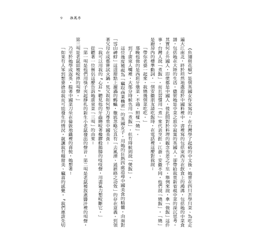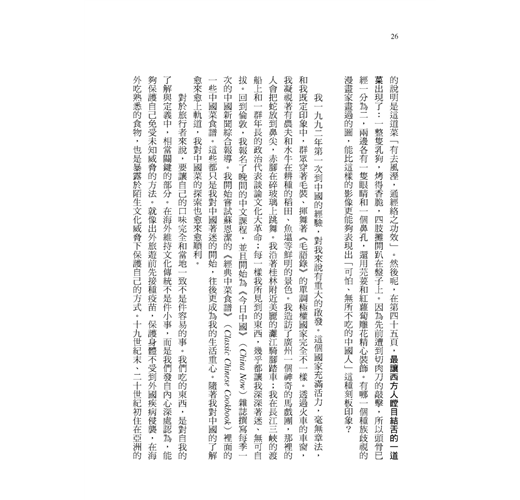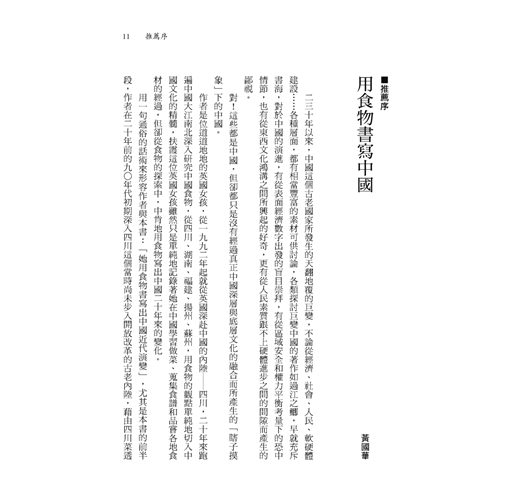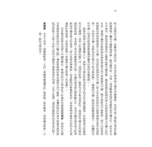 扶霞這位英國女孩雖然只是單純地記錄著她在中國學習做菜、蒐集食譜和品嘗各地食材的經過,但卻從食物的探索中,中肯地用食物寫出中國二十年來的變化。──黃國華(文字工作者)