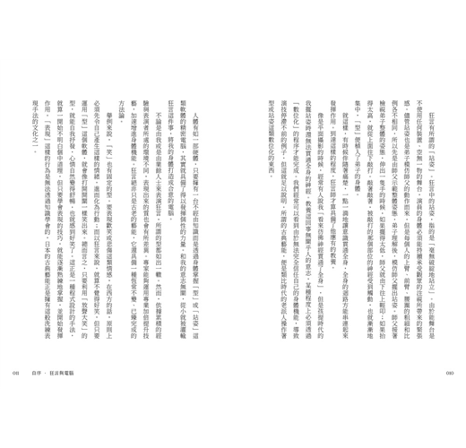 舉例來說,「笑」也有固定的型。要表現歡笑或悲傷這類情感,在西方的話,原則上必須先令自己產生這樣的情緒,進而化為行動;而以狂言來說,就算不覺得好笑,但只要運用「型」這個軟體,就會像打開開關一樣笑出來。總而言之,只要利用「放聲大笑」的型,就能自我抒發,心情自然變得舒暢,也就感到好笑了。這正是一種程式設計的手法,就算一開始不明白個中道理,但只要學會表現的技巧,就能逐漸熟練地掌握,並開始發揮作用。「表現」這樣的行為是無法透過知識學會的,日本的古典藝能正是擁有這般洗練表現手法的文化之一。