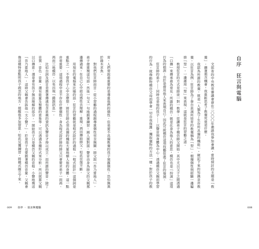 狂言師的弟子──同時也是他的孩子──以聲音與身體為中心、透過模仿父親而學習的行為,就像動物模仿父母而學會一切自我保護、獲取獵物的方法一樣。對於孩子的教育,人們常說最重要的是尊重他們的個性,但是要不具備教養的孩子展露個性,恐怕無異於緣木求魚。