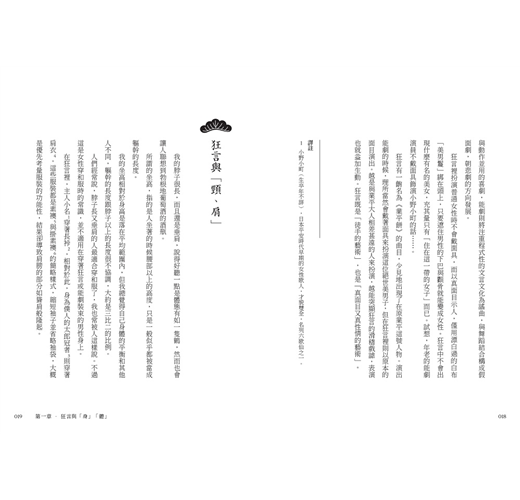 但另一方面,自古以來的六百年間,能樂世界裡只有男性才能登台演出,這項規定並非蔑視女性,而是因為能樂的表演必須仰賴男性剛強的肉體型態。雖然不會直接顯露出來,觀眾卻能感受到在厚重的裝束下,歷經訓練而洗練的男性軀體,跟芭蕾這樣的藝術形式──包覆在緊身舞衣與褲襪下,展現有如西洋雕刻般的真實肉體──正形成了對比。